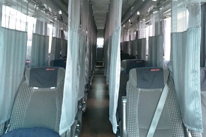 車窓の眺めも車高の高いバスの醍醐味。折り目加工(プリーツ加工)でお客様の眺めも車内空間もすっきりします。